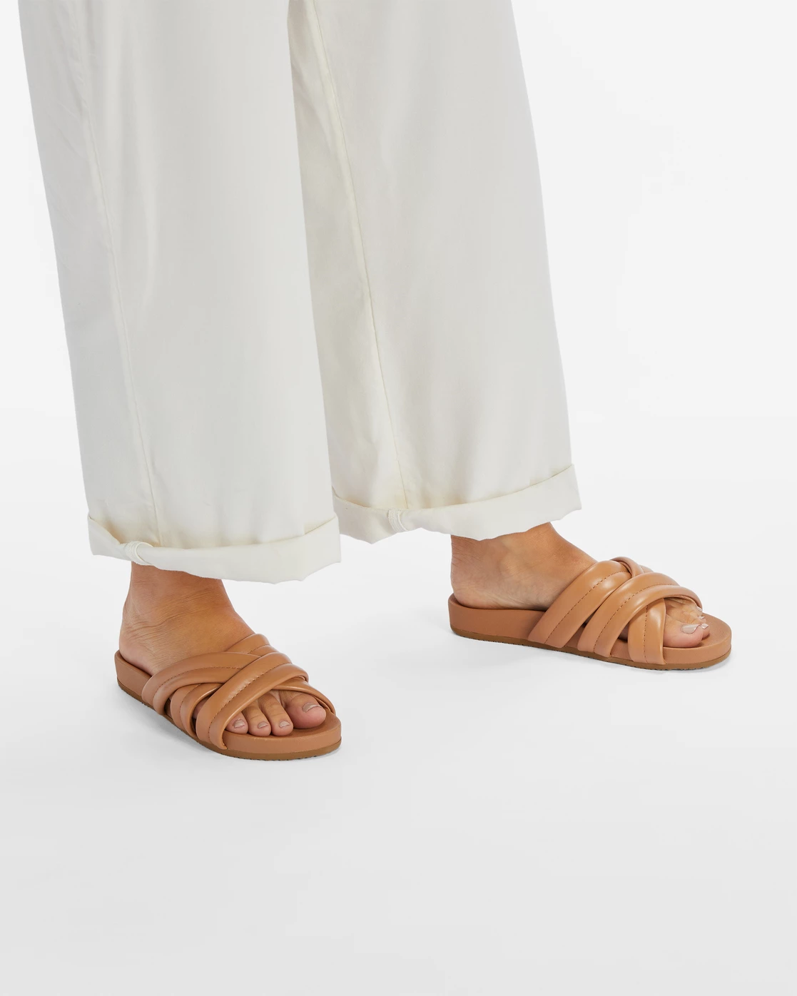 Slide into your comfort mode with this padded cross-strap slide sandal. Complete with a vegan-friendly leather upper and a contoured footbed to keep you comfy on your feet.